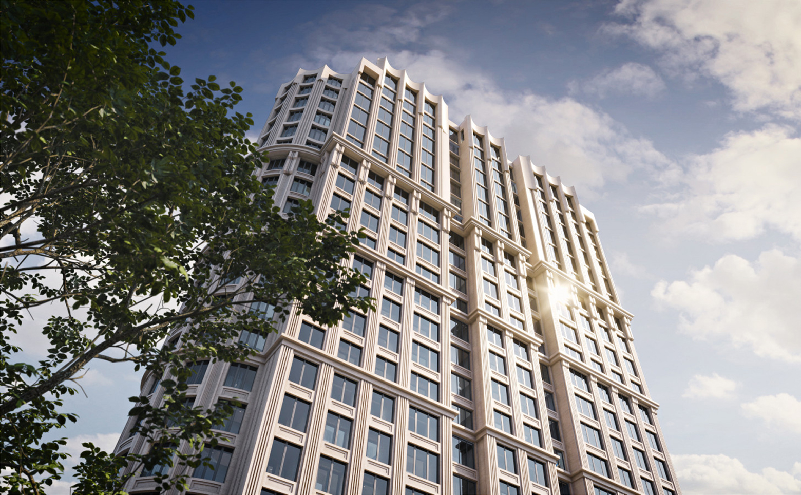 Проект представляет собой дом высотой в 25 этажей. Его облик создали в архитектурном бюро «НИиПИ Спецреставрация» с отсылкой к стилям сталинского ампира и ар-деко. Отличительной чертой здания является венчающий «карниз», который выполнен в виде волн. Парадный вестибюль с роскошными авторскими люстрами от Bezhko впечатляет своим простором и потолками в 5 метров. Два настенных водопада и флорариумы дополняют уникальный образ интерьера. В доме спроектированы кинотеатр, комната для водителей, коворкинг, комната для спорта, KIDS CLUB и просторные колясочные. На территории всего дома предусмотрены самораспошные двери и Face key, а лифт можно вызвать через специальное приложение.
